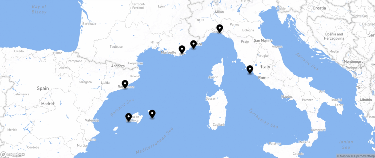 Evrima sails to a variety of destinations, including the Mediterranean, Caribbean, Central America, and South America. Its itineraries are curated to allow for extended stays in port, enabling guests to immerse themselves in local cultures and experiences. The yacht's size and design enable access to exclusive harbors, offering a unique perspective on each destination.