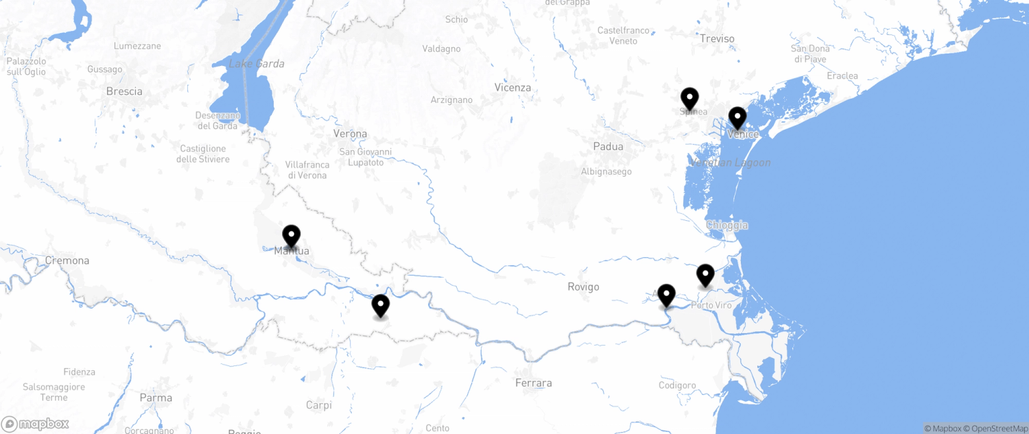 Map showing locations along the Italian River Cruises route between Venice and Mantua, highlighting key stops.