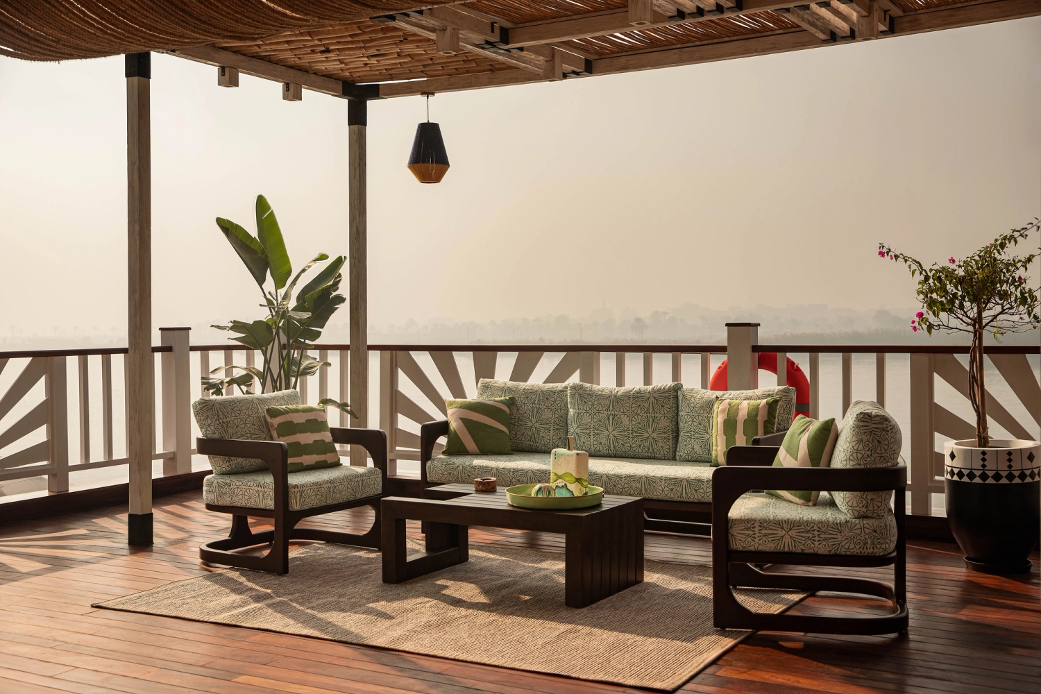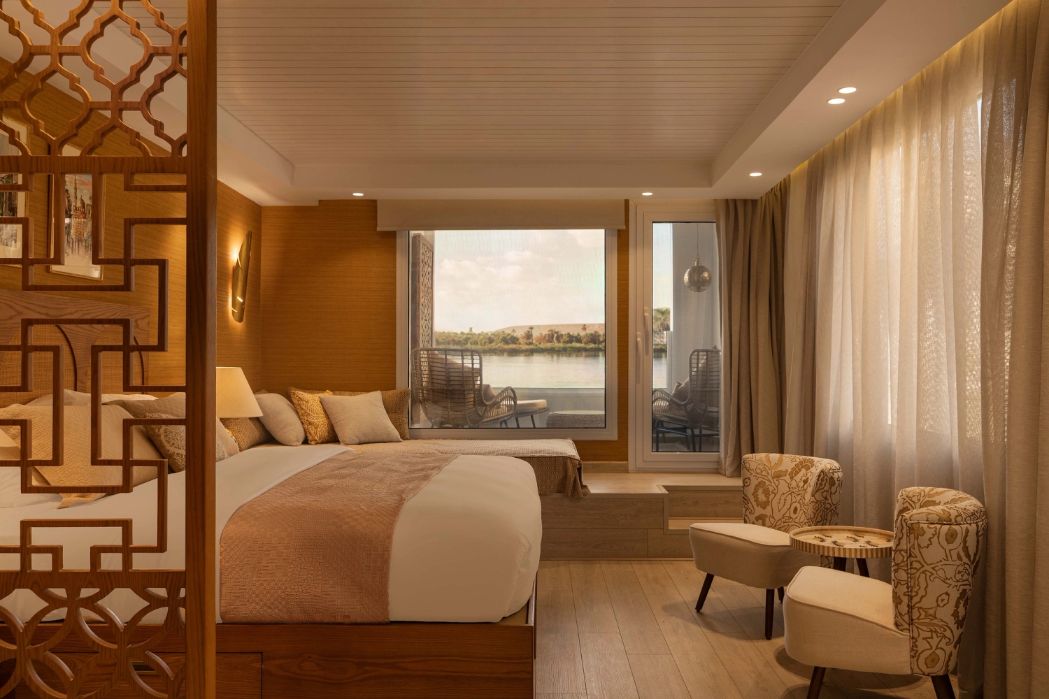 Onboard amenities emphasize comfort, elegance, and open-air relaxation. Guests enjoy indoor and outdoor lounges and dining areas, sunbeds, open-air bars, and a sundeck Jacuzzi designed for panoramic river views. The ship features both indoor and outdoor bars, Wi-Fi, onboard entertainment, wellness services available upon request, and an advanced UV-treated filtered water system throughout. Every shared space is intended to maintain a calm and refined atmosphere, supported by a quiet-hours service protocol.