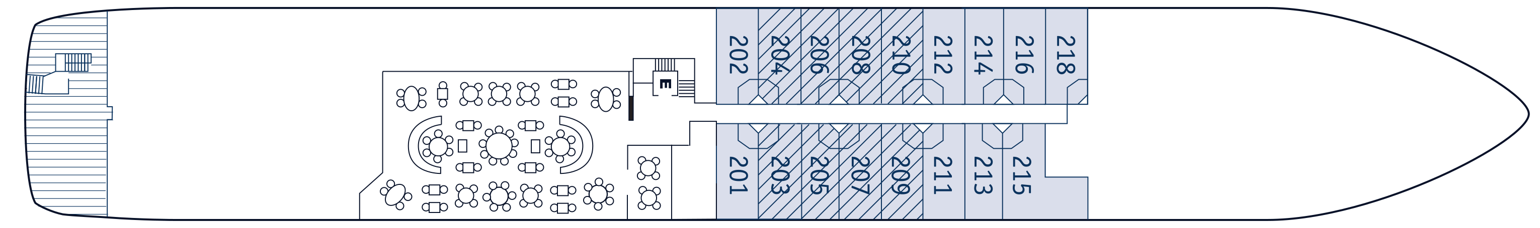 The stateroom’s décor reflects a timeless yachting aesthetic, with warm wood furnishings, a built-in writing desk or vanity, and ample closet space. The marble-accented bathroom is equipped with a multi-jet shower, fine bath products, thick towels, and comfortable robes and slippers. Additional amenities include a flat-screen entertainment system, a well-stocked minibar, individual climate control, and 24-hour room service.