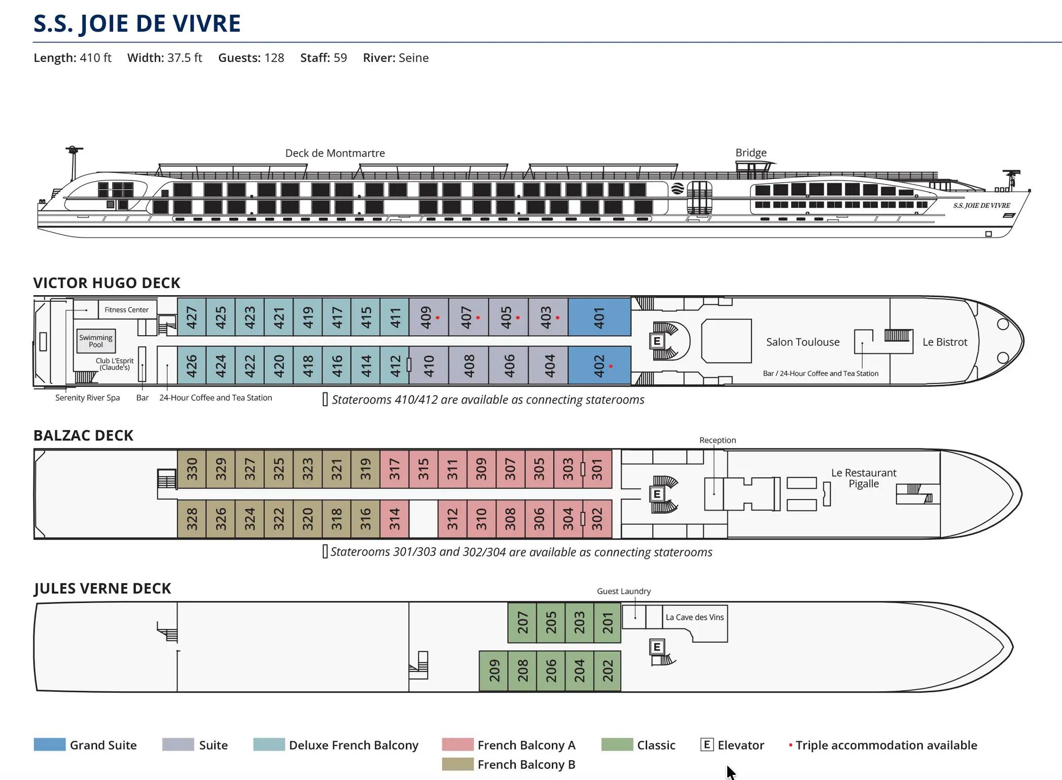 Blending classic artistry with contemporary luxury, the S.S. Joie de Vivre offers an inviting retreat where comfort meets culture. Guests can unwind in intimate lounges, savor French-inspired cuisine, and soak in the ever-changing river views from elegant public spaces. Every moment aboard embodies the “joy of living,” offering a timeless and immersive experience of French elegance at its finest.